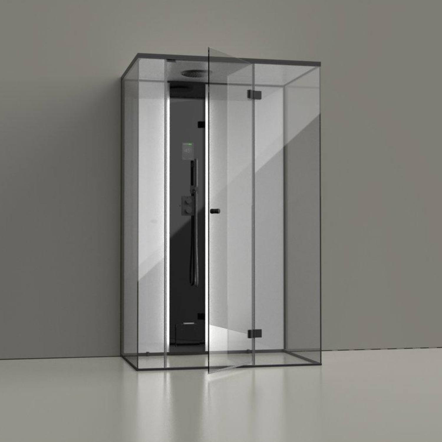 Per 2 minutes nuo įjungimo duše pasiekiama norima temperatūra. Termostatas, maišytuvas ir rankinis dušas Dornbracht. Vyriai ir durų rankenos Pauli. Durys yra su magnetiniu uždarymu (pritraukėju). Garų purkštukas labai tylus ir saugus.