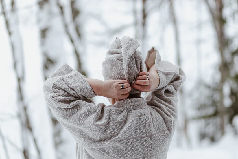 Saunos turbanas yra labai patogus dėvėti karštoje vonioje ar saunoje, nes jis laiko plaukus vietoje ir gerai apsaugo juos. Taip pat galite leisti plaukams natūraliai išdžiūti su lino turbanu. Šis rankšluostis yra labai patogus ir lengvai naudojamas.
